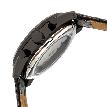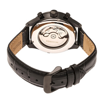 Black-plated stainless steel case with a black leather strap. Fixed black-plated bezel. Black dial with luminous silver-tone hands and index hour markers. Roman numerals appear at the 6 and 12 o'clock positions. Minute markers around the outer rim. Dial Type: Analog. Luminescent hands and markers. Date display between the 4 and 5 o'clock positions. Three multi-function sub-dials displaying: 24 hours, month and day of the week. Automatic movement with a 36-hour power reserve. Scratch resistant mineral crystal. Transparent case back. Round case shape. Case size: 40 mm. Case thickness: 14 mm. Band width: 20 mm. Tang clasp. Water resistant at 50 meters / 165 feet. Functions: month, date, day, GMT, second time zone, hour, minute, second. Benedict Series. Casual watch style. Item Variations: HRT-HR6805. Heritor Benedict Automatic Black Dial Men's Watch HR6805.