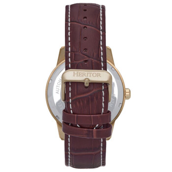 Band Color: Brown Genuine Leather; Band Width: 22mm near case; 20mm near clasp/buckle; Bezel Color: Gold; Case: Gold + Circle-Shaped; Case Finish: Brushed + Stainless Steel; Case Thickness: 12mm; Case Width: 44mm; 48mm with Crown; Clasp / Buckle: Strap Buckle; Dial: White + Analog; Hand Color: Gold; Movement: Chinese + Automatic; Time Zones: Single; Water Resistance: 5 ATM.