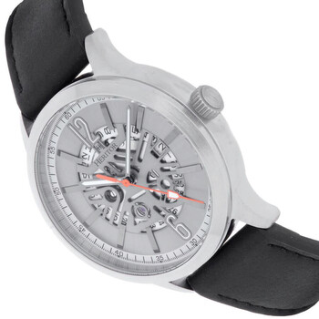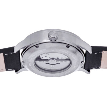 Silver-tone stainless steel case with a black genuine leather strap. Fixed silver-tone stainless steel bezel. Grey dial with silver-tone hands and Arabic numeral hour markers. Minute markers around the outer rim. Dial Type: Analog. Luminescent hands and markers. Date display at the 3 o'clock position. Automatic movement. Pull / push crown. Transparent see through case back. Round case shape, case size: 43 mm, case thickness: 14 mm. Band width: 22 mm, band length: 8.5 inches. Buckle clasp. Water resistant at 100 meters / 330 feet. Functions: date, hour, minute, second. Dayne Series. Casual watch style. Watch label: Japan Movt. Heritor Dayne Automatic Grey Dial Men's Watch HERHS2608.