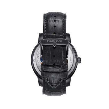 Black stainless steel case with a black genuine leather strap. Fixed black stainless steel bezel. Black dial with silver-tone hands and index hour markers. Minute markers around the outer rim. Dial Type: Analog. Luminescent hands. Automatic movement. Pull / push crown. Round case shape, case size: 45 mm. Water resistant at 100 meters / 330 feet. Functions: hour, minute, second. Emmanuel Series. Casual watch style. Heritor Emmanuel Automatic Black Dial Men's Watch HERHS3702.