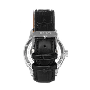 Band Color: Black Genuine Leather; Band Width: 21mm near case; 20mm near clasp/buckle; Bezel Color: Brown; Case: Silver + Circle-Shaped; Case Finish: Brushed + Stainless Steel; Case Thickness: 15mm; Case Width: 42mm; 47mm with Crown; Clasp / Buckle: Strap Buckle; Dial: Black + Analog; Hand Color: Silver; Movement: Chinese + Automatic; Time Zones: Single; Water Resistance: 10 ATM. Silver-tone stainless steel case with a black genuine leather strap. Fixed brown stainless steel bezel. Black dial with silver-tone hands and Arabic numeral & index hour markers. Minute markers around the outer rim. Dial Type: Analog. Luminescent hands and markers. Date display at the 3 o'clock position. Automatic movement. Scratch resistant mineral crystal. Pull / push crown. Transparent case back. Round case shape, case size: 42 mm, case thickness: 15 mm. Band width: 21 mm, band length: 8.25 inches. Buckle clasp. Water resistant at 100 meters / 330 feet. Functions: date, hour, minute, second. Everest Series. Casual watch style. Heritor Everest Automatic Black Dial Men's Watch HERHS1601.