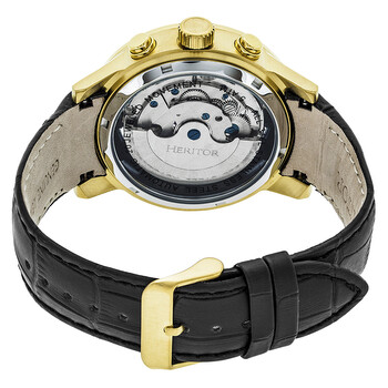 Gold-tone stainless steel case with a black (croco-embossed) leather strap. Fixed gold-tone bezel. Silver (open heart) dial with gold-tone hands and index hour markers. Minute markers around the outer rim. Dial Type: Analog. Two multi-function sub-dials displaying: day of the week and date. Automatic movement with a 42-hour power reserve. Scratch resistant sapphire-coated mineral crystal. Pull / push crown. Transparent case back. Round case shape. Case size: 44 mm. Case thickness: 15 mm. Band width: 22 mm. Tang clasp. Water resistant at 50 meters / 165 feet. Functions: date, day, hour, minute, second. Hannibal Series. Casual watch style. Heritor Hannibal Automatic Silver Dial Black Leather Men's Watch HR4103.