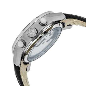 Stainless steel case with a black (croco-embossed) leather strap. Fixed stainless steel bezel. Black (open heart) dial with luminous silver-tone hands and index hour markers. Minute markers around the outer rim. Dial Type: Analog. Luminescent hands and markers. Two multi-function sub-dials displaying: day of the week and date. Automatic movement with a 42-hour power reserve. Scratch resistant sapphire-coated mineral crystal. Pull / push crown. Transparent case back. Round case shape. Case size: 44 mm. Case thickness: 15 mm. Band width: 22 mm. Tang clasp. Water resistant at 50 meters / 165 feet. Functions: date, day, hour, minute, second. Additional Info: average gain/loss rate: +/- 45 seconds per day. Hannibal Series. Casual watch style. Heritor Hannibal Black Open Heart Dial Black Leather Men's Watch HR4102.