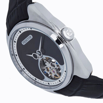 Band Color: Black Genuine Leather; Band Width: 22mm near case; 20mm near clasp/buckle; Bezel Color: Silver; Case: Silver + Circle-Shaped; Case Finish: Polished + Stainless Steel; Case Thickness: 12mm; Case Width: 46mm; 48mm with Crown; Clasp / Buckle: Strap Buckle; Dial: Black + Analog; Hand Color: Silver; Movement: Chinese + Automatic; Time Zones: Single; Water Resistance: 5 ATM.