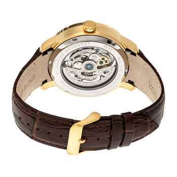 Yellow gold-tone stainless steel case with a dark brown (croco-embossed) leather strap. Fixed yellow gold-tone bezel. Silver (skeleton center) dial with luminous yellow gold-tone hands and index hour markers. Minute markers around the outer rim. Dial Type: Analog. Luminescent hands. Automatic movement. Scratch resistant sapphire-coated mineral crystal. Pull / push crown. Transparent case back. Round case shape. Case size: 44 mm. Case thickness: 13 mm. Band width: 22 mm. Tang clasp. Water resistant at 50 meters / 165 feet. Functions: hour, minute, second. Ryder Series. Casual watch style. Heritor Ryder Automatic Black Skeleton Dial Men's Watch HR4605.