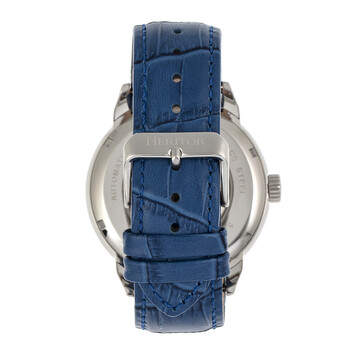 Stainless steel case with a blue leather strap. Fixed stainless steel bezel. White dial with luminous black hands and index hour markers. Roman numerals appear at the 6 and 12 o'clock positions. Minute markers around the outer rim. Dial Type: Analog. Luminescent hands and markers. Automatic movement with a 36-hour power reserve. Scratch resistant mineral crystal. Pull / push crown. Transparent case back. Round case shape. Case size: 45 mm. Case thickness: 13 mm. Band width: 22 mm. Tang clasp. Water resistant at 50 meters / 165 feet. Functions: hour, minute, second. Sanford Series. Dress watch style. Watch label: Chinese Movt. Item Variations: HRT-HR8301. Heritor Sanford Automatic White Dial Men's Watch HR8301.