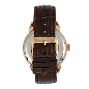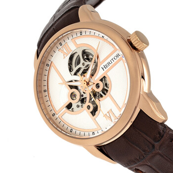Rose gold-tone stainless steel case with a brown leather strap. Fixed rose gold-tone bezel. White (open-cut) dial with luminous rose gold-tone hands and index hour markers. Roman numerals appear at the 6 and 12 o'clock positions. Minute markers around the outer rim. Dial Type: Analog. Luminescent hands and markers. Automatic movement with a 36-hour power reserve. Scratch resistant mineral crystal. Pull / push crown. Transparent case back. Round case shape. Case size: 45 mm. Case thickness: 13 mm. Band width: 22 mm. Tang clasp. Water resistant at 50 meters / 165 feet. Functions: hour, minute, second. Sanford Series. Dress watch style. Watch label: Chinese Movt. Item Variations: HRT-HR8304. Heritor Sanford Automatic White Dial Men's Watch HR8304.