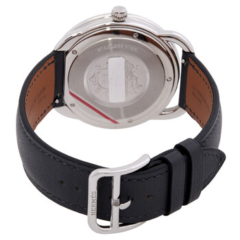 Silver-tone stainless steel case with a black leather strap. Fixed silver-tone stainless steel bezel. Blue dial with silver-tone hands and Arabic numeral hour markers. Minute markers around the iner rim. Dial Type: Analog. Date display at the 6 o'clock position. Quartz movement. Scratch resistant sapphire crystal. Pull / push crown. Solid case back. Round case shape, case size: 40mm. Buckle clasp. Water resistant at 30 meters / 100 feet. Functions: date, hour, minute, second. Arceau Series. Dress watch style. Watch label: Swiss Made. Hermes Arceau Quartz Blue Dial Ladies Watch 057237WW00.