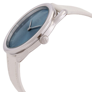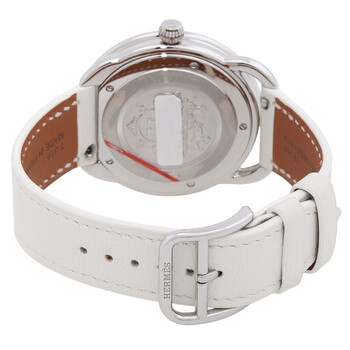 Silver-tone stainless steel case with a white leather strap. Fixed silver-tone stainless steel bezel. Blue dial with silver-tone hands and Arabic numeral hour markers. Dial Type: Analog. Quartz movement. Scratch resistant sapphire crystal. Pull / push crown. Solid case back. Round case shape. Buckle clasp. Water resistant at 30 meters / 100 feet. Functions: hour, minute. Arceau Series. Casual watch style. Watch label: Swiss Made. Hermes Arceau Quartz Blue Dial Watch 057267WW00.