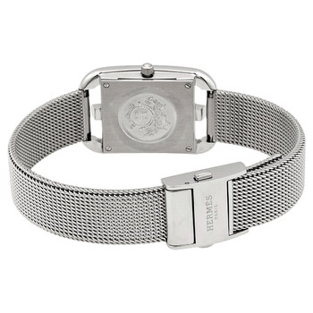 Stainless steel case with a stainless steel mesh bracelet. Fixed stainless steel bezel. Silver dial with silver-tone hands and Arabic numeral hour markers. Dial Type: Analog. Quartz movement. Scratch resistant sapphire crystal. Pull / push crown. Solid case back. Square case shape. Case dimnensions: 23 mm x 23 mm. Water resistant at 30 meters / 100 feet. Functions: hour, minute. Cape Cod Series. Luxury watch style. Watch label: Swiss Made. Hermes Cape Cod Quartz Silver Dial Ladies Watch 045766WW00.