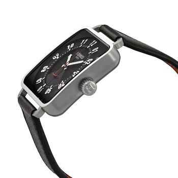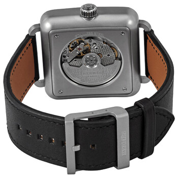 Stainless steel case with a black (calfskin) leather strap. Fixed stainless steel bezel. Black guilloche dial with luminous silver-tone hands and Arabic numeral hour markers. Minute markers around an inner ring. Dial Type: Analog. Luminescent hands and markers. Automatic movement. Scratch resistant sapphire crystal. Pull / push crown. Transparent case back. Square case shape. Case dimensions: 38 mm x 38 mm. Tang clasp. Water resistant at 30 meters / 100 feet. Functions: hour, minute, second. Carre H Series. Luxury watch style. Hermes Carre H Automatic Black Guilloche Dial Men's Watch 045777WW00.