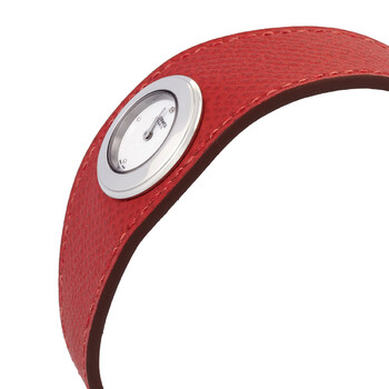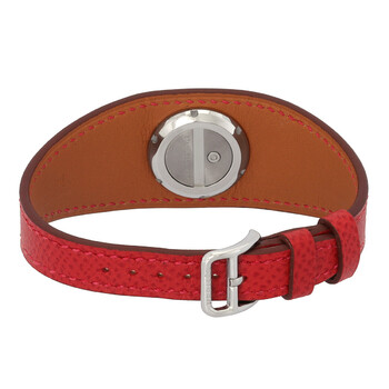 Silver-tone stainless steel case with a red leather strap. Fixed silver-tone stainless steel bezel. White dial with silver-tone hands and diamond hour markers. Dial Type: Analog. Quartz movement. Scratch resistant sapphire crystal. Pull / push crown. Solid case back. Case size: 20 mm. Round case shape. Tang clasp. Water resistant at 30 meters / 100 feet. Functions: hour, minute. Dress watch style. Watch label: Swiss Made. Hermes Faubourg Manchette White Diamond Dial Ladies Leather Watch 041885WW00.
