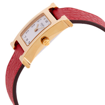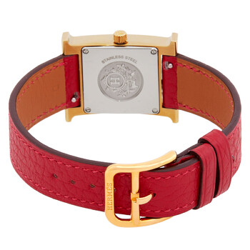 Gold-tone stainless steel case with a red leather strap. Fixed gold-tone stainless steel bezel. White dial with gold-tone hands and Arabic numeral hour markers. Dial Type: Analog. Quartz movement. Scratch resistant sapphire crystal. Pull / push crown. Solid case back. Square case shape. Buckle clasp. Water resistant at 30 meters / 100 feet. Functions: hour, minute. Heure H Series. Casual watch style. Watch label: Swiss Made. Hermes Heure H Quartz White Dial Ladies Watch 040887WW00.