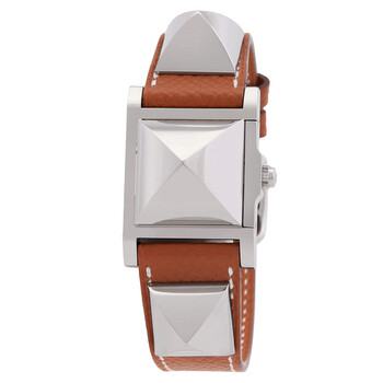 Silver-tone stainless steel case with a two-tone (silver-tone and brown) leather and stainless steel strap. Fixed silver-tone stainless steel bezel. White dial with silver-tone hands. Dial Type: Analog. Quartz movement. Scratch resistant sapphire crystal. Solid case back. Case size: 23 mm x 23 mm. Square case shape. Water resistant at 30 meters / 100 feet. Functions: hour, minute. Luxury watch style. Watch label: Swiss Made. Hermes Medor White Dial Ladies Brown Leather Watch 028321WW00.