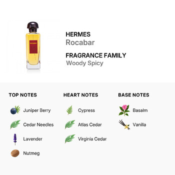 Rocabar's top notes feature the invigorating freshness of juniper berry, cedar needles, lavender, nutmeg, and cinnamon. These elements create an initial burst of energy and warmth, setting the stage for a captivating olfactory journey. As the fragrance develops, heart notes of cypress, Atlas cedar, and Virginia cedar emerge, adding depth and a hint of rugged masculinity.