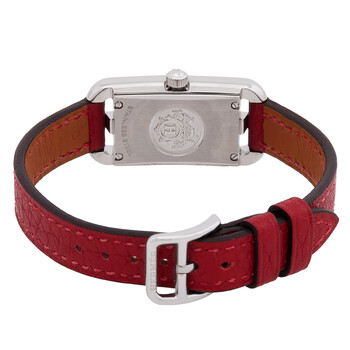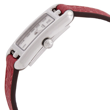 Silver-tone stainless steel case with a red leather strap. Fixed silver-tone stainless steel bezel. White dial with silver-tone hands and Arabic numeral hour markers. Dial Type: Analog. Quartz movement. Scratch resistant sapphire crystal. Pull / push crown. Solid case back. Rectangle case shape. Buckle clasp. Water resistant at 30 meters / 100 feet. Functions: hour, minute. Nantucket Series. Casual watch style. Watch label: Swiss Made. Hermes Nantucket Quartz White Dial Watch 047100WW00.