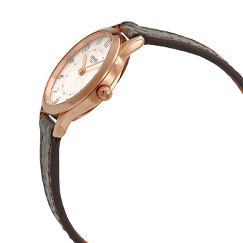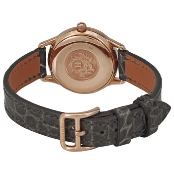 18kt rose gold case with a elephant grey (smooth alligator) leather strap. Fixed 18kt rose gold bezel. Silver dial with rose gold-tone hands and Arabic numeral hour markers. Minute markers around an inner ring. Dial Type: Analog. Quartz movement. Scratch resistant sapphire crystal. Pull / push crown. Solid case back. Round case shape. Case size: 25 mm. Tang clasp. Water resistant at 30 meters / 100 feet. Functions: hour, minute. Slim D Series. Dress watch style. Watch label: Swiss Made. Hermes Slim D Quartz Silver Dial Ladies Watch 041746WW00.