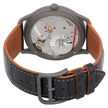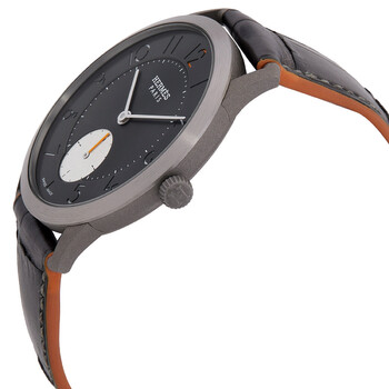 Titanium case with a black leather strap. Fixed titanium bezel. Black dial with silver-tone hands and Arabic numeral hour markers. Dial Type: Analog. One subdial displaying: small seconds. Hermes Calibre H1950 automatic movement with a 42-hour power reserve. Scratch resistant sapphire crystal. Pull / push crown. Solid case back. Round case shape, case size: 39.5 mm, case thickness: 8.14 mm. Water resistant at 30 meters / 100 feet. Functions: hour, minute, second. Slim D'hermes Series. Hermes Slim DHermes Automatic Black Dial Men's Watch 047665WW00.