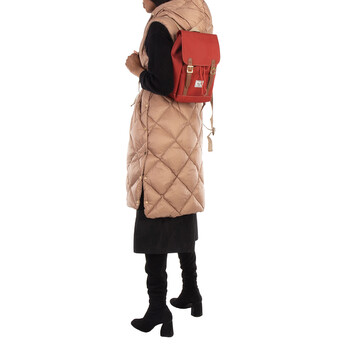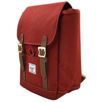 Herschel Unisex Backpack. SKU: 11398-06284. Barcode: 828432647385. Color: Red. Size: 11.5" (H) x 9" (W) x 5" (D)29cm (H) x 23cm (W) x 12.5cm (D). Herschel Retreat Mini Backpack in Red. Made from 100% recycled EcoSystem™ fabrics, this backpack features an easy U-pull cord closure and adjustable smooth webbing shoulder straps. It includes magnetic hangers with metal pin buckles, a front storage slot, and an internal storage sleeve. Inside, you'll find the "Put Yourself Out There™" internal tag and an internal Herschel Supply stripe DNA tab.