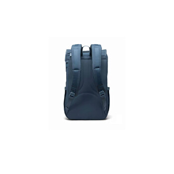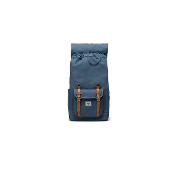 Herschel Unisex Backpack. SKU: 11390-06105. Barcode: 828432623525. Color: Blue. Size: 49cm (H) x 29cm (W) x 18cm (D). Herschel Supply Little America Backpack in Blue. Made from 100% recycled post-consumer water bottles, this backpack features a tonal stripe EcoSystem™ liner, also crafted from recycled materials. It includes a padded and fleece-lined floating sleeve that fits a 15"/16" laptop, an easy U-pull drawcord closure, and adjustable EVA-padded shoulder straps for comfort. The backpack is compatible with a sternum strap for added support and has magnet-fastened straps with metal pin buckles. For easy access, there's a side-entry zipper, dual water bottle pockets that expand to accommodate different sizes, and a top lid pocket with a key clip. Additionally, it features a zippered front pocket, a "Put Yourself Out There™" internal label, and an internal Herschel Supply stripe DNA tab.