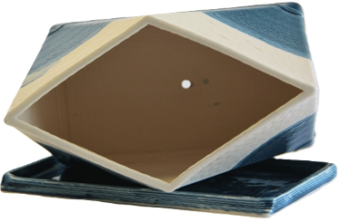 რომბის ფორმის თეთრი თიხის ქოთანი სადგამით, შექმნილია თიხის 3დ პრინტერით, 2-ჯერ გამომწვარი და გარედან მოჭიქურებულია. მასალა ეკოლოგოურად სუფთაა და იდეალურია ოთახის ან აივნის მცირე ზომის მცენარისთვის. სიგრძე 11 სმ და სიმაღლე 8 სმ.