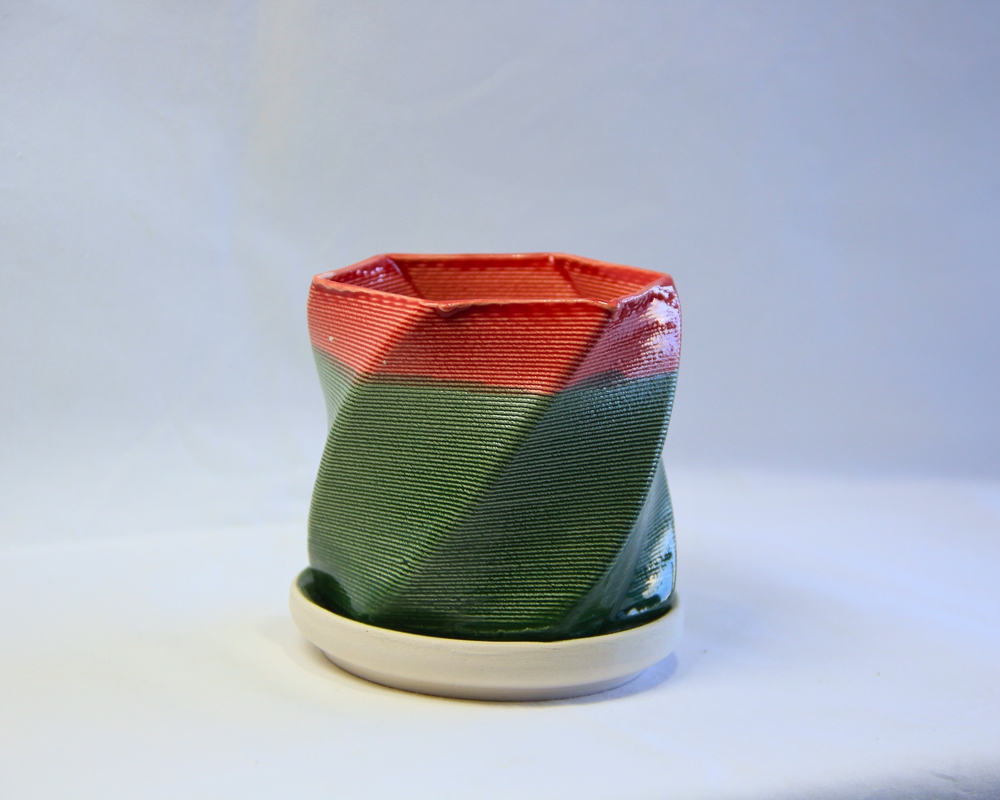 სპირალის ფორმის თეთრი თიხის მინიატურული ქოთანი სადგამით, შექმნილია თიხის 3დ პრინტერით, 2-ჯერ გამომწვარი და გარედან მოჭიქურებულია. მასალა ეკოლოგოურად სუფთაა და იდეალურია ოთახის ან აივნის მცირე ზომის მცენარისთვის. დიამეტრი 8 სმ და სიმაღლე 9 სმ.