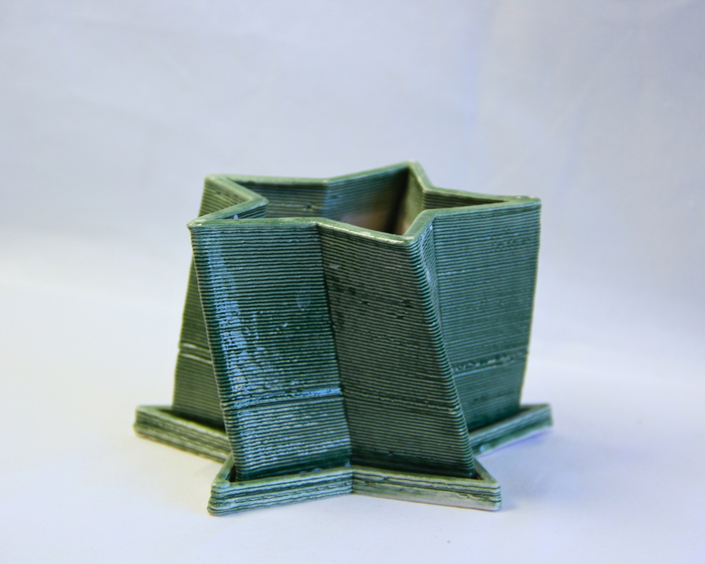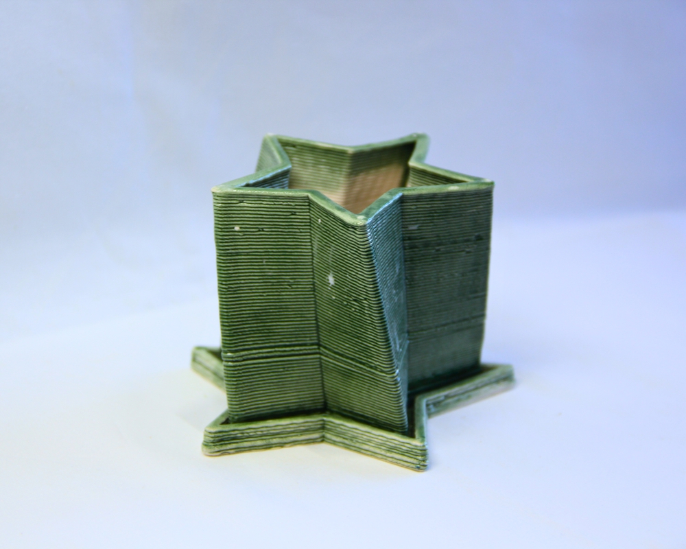 ვარსკვლავის ფორმის თეთრი თიხის ქოთანი სადგამით, შექმნილია თიხის 3დ პრინტერით, 2-ჯერ გამომწვარი და გარედან მოჭიქურებულია. მასალა ეკოლოგოურად სუფთაა და იდეალურია ოთახის ან აივნის მცირე ზომის მცენარისთვის. დიამეტრი 9 სმ და სიმაღლე 8 სმ.
