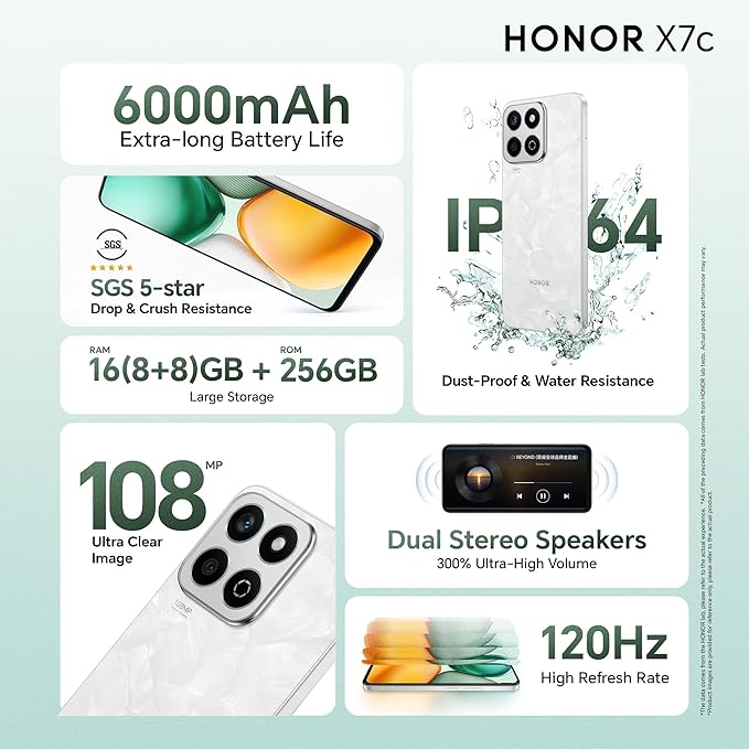 Honor X7c სმარტფონი 6.77"-იანი LCD ეკრანით, რომელსაც აქვს მაღლი გარჩევადობა. რვა ბირთვიანი, მაღალი წარმადობის მქონე პროცესორი უზრულველყოფს, ნებისმიერი ოპერაციის სწრაფად და შეუფერხებლად შესრულებას, ხოლო ჩაშენებული სტერეო დინამიკები გამოირჩევა ხმის მაღალი ჟღერადობით. მოწყობილობას ასევე აქვს IP64 რეიტინგი - არის წყალ და ნესტგამძლე.