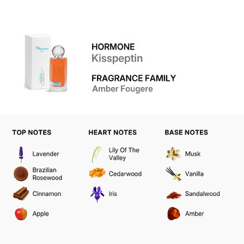 Belonging to the distinguished Amber Fougere fragrance family, Kisspeptin opens with an inviting burst of lavender, warm cinnamon, sweet apple, and exotic Brazilian rosewood. These top notes create a fresh and spicy introduction that is both comforting and energizing. As the fragrance evolves, heart notes of delicate lily of the valley, rich cedarwood, and smooth iris unfold, adding a refined floral and woody depth.