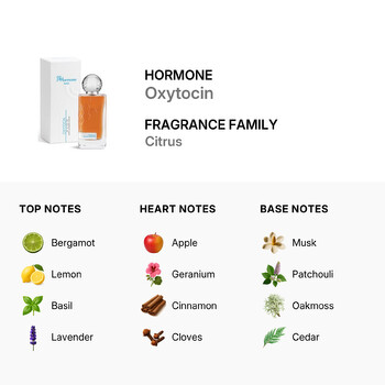 Part of the citrus fragrance family, Oxytocin opens with a fresh and uplifting burst of bergamot, lemon, basil, and lavender. These bright top notes create an energizing first impression that captures attention and sets the tone for the journey ahead. As the scent evolves, heart notes of crisp apple, floral geranium, warm cinnamon, and spicy cloves gently unfold, adding depth and character to the fragrance.