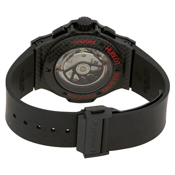 Black carbon fiber case with a black rubber strap. Fixed bezel. Skeleton dial with luminous red hands and index hour markers. Minute markers around the outer rim. Dial Type: Analog. Luminescent hands and markers. Date display between 4 and 5 o'clock position. Chronograph - three sub-dials displaying: 60 second, 30 minute and 12 hour. Automatic movement. Hub4214 unico engine. Scratch resistant sapphire crystal. Pull / push crown. Skeleton case back. Case diameter: 44 mm. Round case shape. Tang clasp. Water resistant at 100 meters / 330 feet. Functions: hour, minute, second, date, chronograph. Luxury watch style. Watch label: Swiss Made. Item Variations: 311 QX 1134 RX, 311-QX-1134-RX, 311/QX/1134/RX, 311QX1134RX. Hublot Aero Bang Red Magic Chronograh Automatic Men's Watch 311QX1134RX.