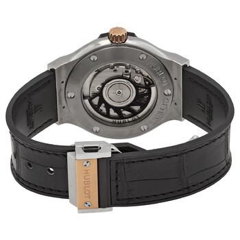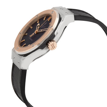 Grey (polished) titanium case with a black leather strap. Fixed 18kt rose gold bezel. Black dial with rose gold-tone hands and index hour markers. Dial Type: Analog. Date display at the 3 o'clock position. Hublot calibre HUB1110 Automatic movement, based upon Sellita SW300-1, containing 21 Jewels, composed of 63 parts, bitting at 28800 vph, and has a power reserve of approximately 42 hours. Scratch resistant sapphire crystal. Pull / push crown. Transparent case back. Round case shape. Case size: 38 mm. Case thickness: 10 mm. Fold over clasp with a push button release. Water resistant at 50 meters / 165 feet. Functions: date, hour, minute, second. Luxury watch style. Watch label: Swiss Made. Item Variations: 565 NO 1180 LR, 565-NO-1180-LR, 565/NO/1180/LR, 565NO1180LR. Hublot Automatic Black Dial Black Leather Men's Watch 565.NO.1180.LR.
