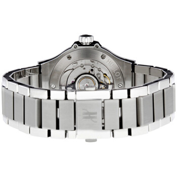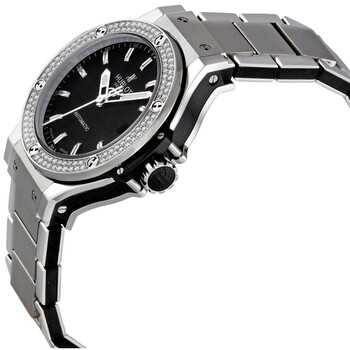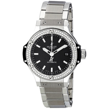 Stainless steel case with a stainless steel bracelet. Fixed silver-tone bezel set with 126 diamonds. Black dial with silver-tone hands and index hour markers. Minute markers around the outer rim. Dial Type: Analog. Luminescent hands. Date display at the 3 o'clock position. Automatic movement. Scratch resistant sapphire crystal. Screw down crown. Solid case back. Case diameter: 38 mm. Deployment clasp. Water resistant at 100 meters / 330 feet. Functions: date, hour, minute, second. Luxury watch style. Watch label: Swiss Made. Hublot Big Bang Automatic Black Dial Stainless Steel Men's Watch 365.SX.1170.SX.1104.