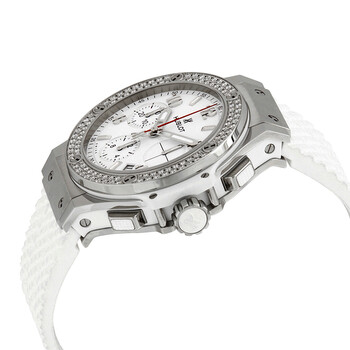 Stainless steel case with a white rubber strap. Fixed stainless steel bezel set with 114 diamonds. White dial with luminous silver-tone hands and alternating Arabic numeral and stick hour markers. Arabic numeral minute markers (at 5 minute intervals). Minute markers around the outer rim. Dial Type: Analog. Luminescent hands and markers. Date display between the 4 and 5 o'clock positions. Chronograph - three sub-dials displaying: 60 second, 30 minute and 12 hour. Hublot calibre HUB1145 automatic movement, containing 37 Jewels, bitting at 28800 vph, and has a power reserve of approximately 42 hours. Scratch resistant sapphire crystal. Pull / push crown. Transparent case back. Round case shape. Case size: 41 mm. Band width: 20 mm. Band length: 7 inches. Fold over clasp with a push button release. Water resistant at 30 meters / 100 feet. Functions: chronograph, date, hour, minute, second. Big Bang Series. Dress watch style. Watch label: Swiss Made. Item Variations: 342 SE 230 RW 114, 342-SE-230-RW-114, 342/SE/230/RW/114, 342SE230RW114. Hublot Big Bang Automatic Chronograph White Dial White Rubber unisex Watch 342SE230RW114.