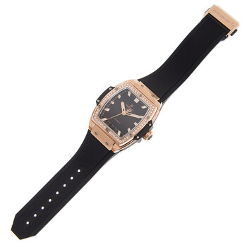Gold-tone 18kt rose gold case with a black rubber strap. Fixed 18kt rose gold diamond set bezel. Black dial with gold-tone skeleton hands and index hour markers. Minute markers around the outer rim. Dial Type: Analog. Luminescent hands and markers. Hublot Calibre HUB1710 Automatic movement, based upon Zenith Elite 670, containing 27 Jewels, bitting at 28800 vph, and has a power reserve of approximately 50 hours. Scratch resistant sapphire crystal. Screw down crown. Transparent case back. Tonneau case shape. Case size: 39 mm. Deployment clasp. Functions: hour, minute, second. Dress watch style. Watch label: Swiss Made. Hublot Big Bang Automatic Diamond Black Dial Watch 665.OX.1180.RX.1204.
