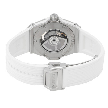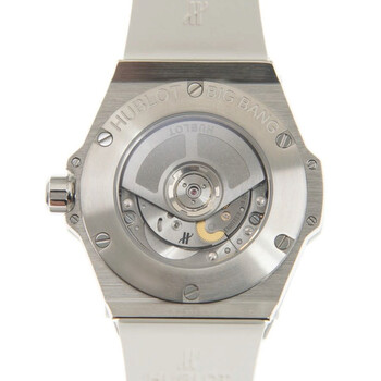 Silver-tone diamond set stainless steel case with a white rubber strap. Fixed silver-tone bezel with diamond set stainless steel. White dial with silver-tone hands and Arabic numeral hour markers. Minute markers around the outer rim. Dial Type: Analog. Luminescent hands and markers. Date display at the 3 o'clock position. Hublot Calibre HUB1120 Automatic movement, containing 18 Jewels, composed of 65 parts, bitting at 28800 vph, and has a power reserve of approximately 40 hours. Scratch resistant sapphire crystal. Transparent see through case back. Round case shape, case size: 33 mm. Deployment with push button release clasp. Water resistant at 100 meters / 330 feet. Functions: date, hour, minute, second. Additional Info: original box, international warranty card, manual (complete accessories). Big Bang Series. Luxury watch style. Watch label: Swiss Made. Hublot Big Bang Automatic Diamond White Dial Ladies Watch 485.SE.2010.RW.1604.