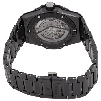 Black ceramic case and bracelet. Fixed black ceramic with 6 h-shaped titanium screws bezel. Transparent dial with silver-tone hands and index hour markers. Minute markers around the outer rim. Dial Type: Analog. Luminescent hands and markers. Date display at the 6 o'clock position. Hublot Calibre HUB1710 Automatic movement, based upon Zenith Elite 670, containing 27 Jewels, bitting at 28800 vph, and has a power reserve of approximately 50 hours. Scratch resistant sapphire crystal. Transparent see through case back. Round case shape, case size: 40 mm. Deployment with push button release clasp. Water resistant at 100 meters / 330 feet. Functions: date, hour, minute, second. Big Bang Series. Sport watch style. Watch label: Swiss Made. Hublot Big Bang Automatic Men's Watch 456.CX.0170.CX.