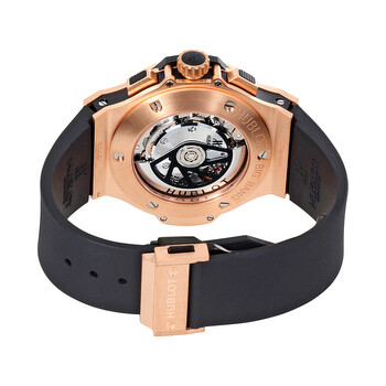 18kt rose gold case with a black rubber strap. Fixed 18kt rose gold bezel. Black dial with luminous rose gold skeleton hands and index hour markers. Minute markers around the outer rim. Dial Type: Analog. Luminescent hands and markers. Date display between the 4 and 5 o'clock positions. Chronograph - three sub-dials displaying: 60 second, 60 minute and 1/10th of a second. Hublot Calibre HUB4100 Automatic movement, based upon ETA 2894-2, containing 27 Jewels, composed of 252 parts, bitting at 28800 vph, and has a power reserve of approximately 42 hours. Scratch resistant sapphire crystal. Pull / push crown. Solid case back. Round case shape, case size: 44 mm, case thickness: 14.5 mm. Deployment with push button release clasp. Water resistant at 100 meters / 330 feet. Functions: chronograph, date, hour, minute, second. Casual watch style. Watch label: Swiss Made. Item Variations: 301 PX 1180 RX, 301-PX-1180-RX, 301/PX/1180/RX, 301PX1180RX. Hublot Big Bang Black Dial 18kt Rose Gold Men's Watch 301.PX.1180.RX.