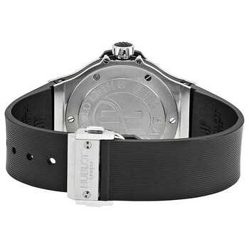 Stainless steel case with a black rubber strap. Fixed silver-tone bezel set with 126 diamonds. Black dial with luminous silver-tone hands and alternating Arabic numeral and index hour markers. Minute markers around the outer rim. Dial Type: Analog. Luminescent hands and markers. Quartz movement. Scratch resistant sapphire crystal. Pull / push crown. Solid case back. Case diameter: 38 mm. Round case shape. Band width: 26 mm. Deployment clasp. Water resistant at 100 meters / 330 feet. Functions: hours, minutes, seconds. Luxury watch style. Hublot Big Bang Black Dial Diamond Black Rubber Ladies Watch 361.SX.1270.RX.1104.