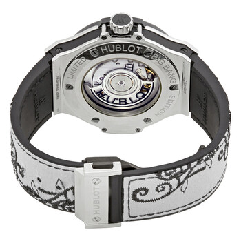Black stainless steel case with a black rubber and silk with embroidery strap. Fixed black carbon fiber and silk bezel. Silver silk with black embroidery dial with silver-tone skeleton hands and 11 diamonds (0.20 carats) hour markers. Dial Type: Analog. Hublot Calibre HUB1110 Automatic movement, based upon Sellita SW300-1, containing 21 Jewels, bitting at 28800 vph, and has a power reserve of approximately 42 hours. Scratch resistant sapphire crystal. Transparent case back. Round case shape, case size: 41 mm, case thickness: 14 mm. Push button folding clasp. Water resistant at 100 meters / 330 feet. Functions: hour, minute, second. Luxury watch style. Watch label: Swiss Made. Hublot Big Bang Broderie Automatic Diamond Men's Watch 343.SS.6570.NR.BSK16.