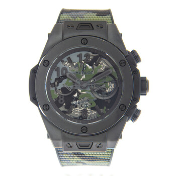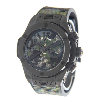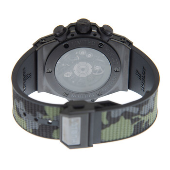 Ceramic case with a green camouflage rubber strap. Fixed ceramic bezel. Green dial with index-Arabic numeral hour markers. Dial Type: Analog. Date display at the 3 o'clock position. Chronograph - two sub-dials displaying: 60 second and 60 minute. Hublot Calibre HUB1242 Automatic movement, based upon Hublot HUB1240, containing 38 Jewels, composed of 330 parts, bitting at 28800 vph, and has a power reserve of approximately 72 hours. Scratch resistant sapphire crystal. Case size: 45 mm. Deployment clasp. Water resistant at 100 meters / 330 feet. Functions: chronograph, column wheel, flyback, date, hour, minute, second. Big Bang Series. Luxury watch style. Watch label: Swiss Made. Hublot Big Bang Camo Yohji Yamamoto Chronograph Automatic Green Dial Men's Watch 411.CI.0114.RX.YOY20.