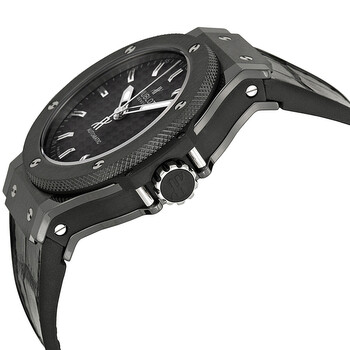 Black ceramic case with a black alligator leather strap. Fixed black ceramic bezel. Black carbon fiber dial with luminous hands and index hour markers. Minute markers around the outer rim. Dial Type: Analog. Luminescent hands and markers. Date display at the 3 o'clock position. Automatic movement. Scratch resistant sapphire crystal. Screw down crown. Skeleton case back. Case diameter: 38 mm. Round case shape. Band width: 21.6 mm. Band length: 8.5 inches. Deployment clasp. Water resistant at 100 meters / 330 feet. Functions: date, hour, minute, second. Luxury watch style. Watch label: Swiss Made. Hublot Big Bang Carbon Fiber Dial Alligator Unisex Watch 365CM1770LR.