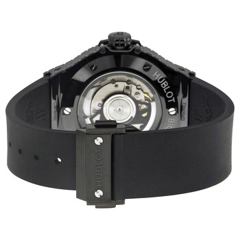 Black ceramic case with a black rubber strap. Fixed black ceramic bezel. Black ceramic dial with silver-tone skeleton hands. No markers. Dial Type: Analog. Date display at the 3 o'clock position. Automatic movement with a 42-hour power reserve. Scratch resistant sapphire crystal. Pull / push crown. Skeleton case back. Case diameter: 41 mm. Round case shape. Band width: 22.9 mm. Band length: 9 inches. Push button fold over clasp. Water resistant at 100 meters / 330 feet. Functions: date, hour, minute, second. Luxury watch style. Watch label: Swiss Made. Hublot Big Bang Caviar Black Dial Automatic Men's Watch 346.CX.1800.RX.