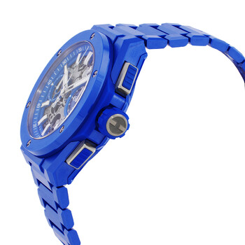 Blue ceramic case and bracelet. Fixed blue ceramic bezel. Mat blue skeleton dial with silver-tone hands and index hour markers. Arabic numeral minute markers (at 5 minute intervals). Dial Type: Analog. Luminescent hands and markers. Date display at the 3 o'clock position. Chronograph - two sub-dials displaying: 60 minute and 60 second. Hublot Calibre HUB1280 Automatic movement, containing 43 Jewels, composed of 354 parts, bitting at 28800 vph, and has a power reserve of approximately 72 hours. Scratch resistant sapphire crystal. Screw down crown. Transparent case back. Round case shape, case size: 42 mm, case thickness: 14.5 mm. Deployant buckle clasp. Water resistant at 100 meters / 330 feet. Functions: chronograph, column wheel, date, hour, minute, second. Big Bang Series. Luxury watch style. Watch label: Swiss Made. Hublot Big Bang Ceramic Chronograph Automatic Men's Watch 451.EX.5129.EX.