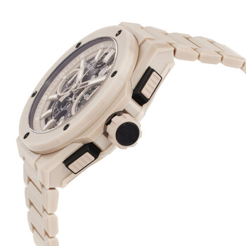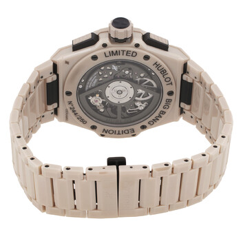 Beige ceramic case and bracelet. Fixed beige ceramic bezel. Mat beige skeleton dial with beige hands and index hour markers. Arabic numeral minute markers (at 5 minute intervals). Dial Type: Analog. Luminescent hands and markers. Date display at the 3 o'clock position. Chronograph - two sub-dials displaying: 60 minute and 60 second. Hublot Calibre HUB1280 Automatic movement, containing 43 Jewels, composed of 354 parts, bitting at 28800 vph, and has a power reserve of approximately 72 hours. Scratch resistant sapphire crystal. Transparent case back. Round case shape, case size: 42 mm. Deployant buckle clasp. Water resistant at 100 meters / 330 feet. Functions: chronograph, column wheel, hour, minute, second. Big Bang Series. Luxury watch style. Watch label: Swiss Made. Hublot Big Bang Ceramic Chronograph Automatic Men's Watch 451.CZ.4620.CZ.