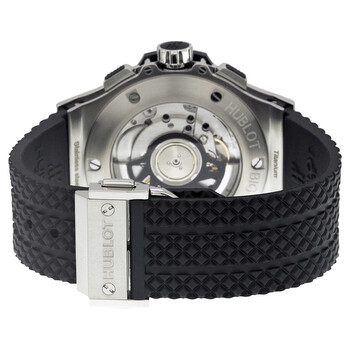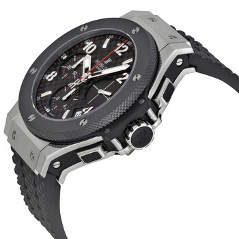 Stainless steel case with center (edge) lateral black Kevlar inserts. with a black rubber strap. Fixed black ceramic bezel. Black carbon fiber dial with luminous hands and alternating Arabic numeral and index hour markers. Arabic numeral minute Markers (at 5 minute intervals). Minute markers around the outer rim. Dial Type: Analog. Luminescent hands and markers. Date display between the 4 and 5 o'clock positions. Chronograph - three sub-dials displaying: 60 second, 30 minute and 12 hour. Hublot calibre HUB2894 automatic movement, containing 37 Jewels, bitting at 28800 vph, and has a power reserve of approximately 42 hours. Scratch resistant sapphire crystal. Pull / push crown. Skeleton case back. Round case shape. Case size: 41 mm. Case thickness: 12 mm. Band width: 21 mm. Band length: 7 inches. Deployment clasp. Water resistant at 100 meters / 330 feet. Functions: chronograph, date, hour, minute, second. Big Bang Series. Dress watch style. Watch label: Swiss Made. Item Variations: 341SB131RX, 341. Hublot Big Bang Chronograph Automatic Carbon Fiber Dial Men's Watch 341.SB.131.RX.