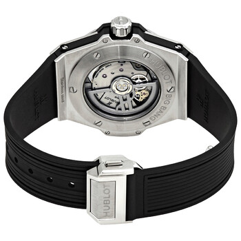 Silver-tone stainless steel with lateral black inserts case with a black lined rubber strap. Fixed silver-tone stainless steel set with 42 diamonds bezel. Black dial with luminous silver-tone hands and alternating Arabic numeral and index hour markers. Minute markers around the outer rim. Dial Type: Analog. Luminescent hands and markers. Date display at the 3 o'clock position. Hublot Calibre HUB1710 Automatic movement, based upon Zenith Elite 670, containing 27 Jewels, bitting at 28800 vph, and has a power reserve of approximately 50 hours. Scratch resistant sapphire crystal. Pull / push crown. Transparent case back. Round case shape, case size: 39 mm. Fold over clasp with a push button release. Water resistant at 100 meters / 330 feet. Functions: chronograph, date, hour, minute, second. Additional Info: 36 brilliant cut diamonds (about 1.31 carats). Big Bang One Click Series. Luxury watch style. Watch label: Swiss Made. Hublot Big Bang Chronograph Automatic Diamond Black Dial Men's Watch 465.SX.1170.RX.1204.