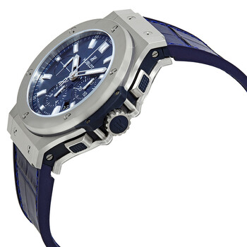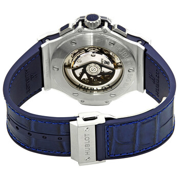 Stainless steel case with lateral blue inserts and a blue rubber strap with a stiched blue (alligator) leather top. Fixed stainless steel bezel. Blue dial with luminous silver-tone skeleton hands and index hour markers. Minute markers around the outer rim. Dial Type: Analog. Luminescent hands and markers. Date display between 4 and 5 o'clock position. Chronograph - three sub-dials displaying: 60 second, 30 minute and 12 hour. Hublot calibre HUB4100 automatic movement, based upon ETA 2894-2, containing 27 Jewels, composed of 252 parts, bitting at 28800 vph, and has a power reserve of approximately 42 hours. Scratch resistant sapphire crystal. Pull / push crown. Transparent case back. Round case shape. Case size: 44 mm. Case thickness: 14.5 mm. Band width: 22 mm. Deployment clasp with a push button release. Water resistant at 100 meters / 330 feet. Functions: chronograph, date, hour, minute, second. Big Bang Series. Luxury watch style. Watch label: Swiss Made. Hublot Big Bang Chronograph Automatic Men's Watch 301.SX.7170.LR.