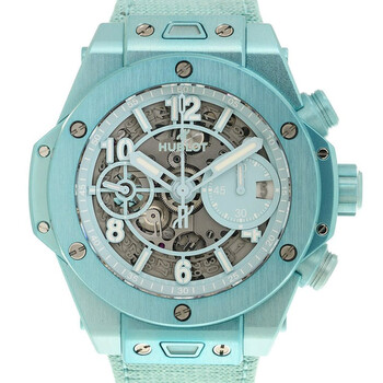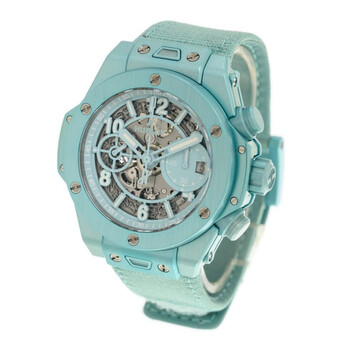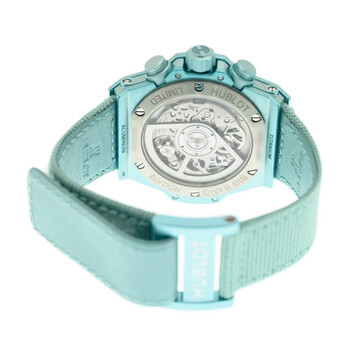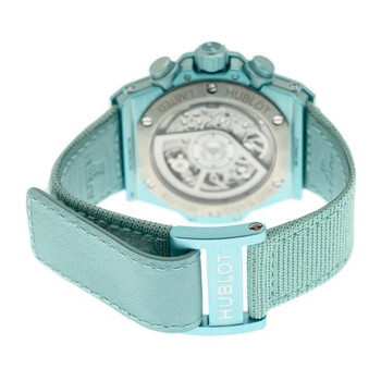 Turquoise composite case with a turquoise canvas strap. Fixed turquoise composite bezel. Transparent dial with turquoise hands and Arabic numeral hour markers. Minute markers around the outer rim. Dial Type: Analog. Luminescent hands and markers. Date display at the 3 o'clock position. Chronograph - two sub-dials displaying: 60 minute and 60 second. Hublot Calibre HUB1280 Automatic movement, containing 43 Jewels, composed of 354 parts, bitting at 28800 vph, and has a power reserve of approximately 72 hours. Scratch resistant sapphire crystal. Transparent see through case back. Round case shape, case size: 42 mm. Fold over clasp. Water resistant at 100 meters / 330 feet. Functions: chronograph, column wheel, hour, minute, second. Additional Info: original box, international warranty card, manual (complete accessories). Big Bang Series. Luxury watch style. Watch label: Swiss Made. Hublot Big Bang Chronograph Automatic Men's Watch 441.UB.5120.NR.