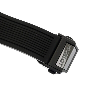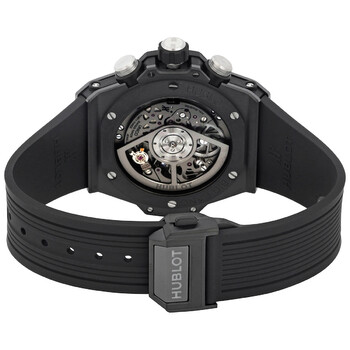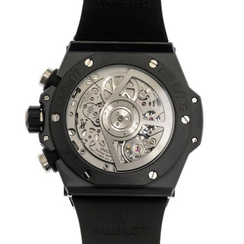 Black ceramic case with a black rubber strap. Fixed black ceramic bezel. Transparent dial with silver-tone hands and Arabic numeral hour markers. Minute markers around the outer rim. Dial Type: Analog. Luminescent hands and markers. Date display at the 3 o'clock position. Chronograph - two sub-dials displaying: 60 minute and 60 second. Hublot calibre HUB1280 automatic movement, containing 43 Jewels, composed of 354 parts, bitting at 28800 vph, and has a power reserve of approximately 72 hours. Scratch resistant sapphire crystal. Transparent see through case back. Round case shape. Case size: 42 mm. Deployment clasp with a push button release. Water resistant at 100 meters / 330 feet. Functions: chronograph, column wheel, hour, minute, second. Additional Info: original box, international warranty card, manual (complete accessories). Big Bang Series. Luxury watch style. Watch label: Swiss Made. Hublot Big Bang Chronograph Automatic Men's Watch 441.CI.1171.RX.